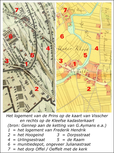 Op de kaart van Visscher is duidelijk 't Logiment van sijn Hoocheyt' vermeld. De kaart toont ook duidelijk de loop van de Oeffeltse Raam. Ook de wegenstructuur en de ligging van het dorp Oeffelt met de kerk op de kaart van Visscher komen goed overeen met de zeer nauwkeurige Kleefse kadasterkaart die een kleine honderd jaar later is gemaakt. Hieruit kunnen we concluderen dat het logement van Frederik Hendrik is geweest in of bij de boerderij op de hoek van de huidige Dorpsstraat en de Kerkstraat-zuid, bij de brug over de Raam.